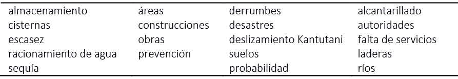 Dentro de los resultados que se encontraron a través de los grupos semánticos de mayor relevancia, desde las perspectivas de las condiciones climáticas y desde los factores territoriales y estructurales, están los relacionados con el recurso hídrico, mencionado a partir de diferentes concepciones: escasez (sequías), exceso (riadas), fuente (lluvias, desmontes) e incluso recolección y disposición final (drenajes y alcantarillados). En la misma línea, se observa la relevancia que es otorgada a las categorías de deslizamientos y desastres, incluidas en las perspectivas desde los factores territoriales y estructurales, y desde la autogestión de las vulnerabilidades. A partir de lo anterior, se puede deducir que las construcciones sociales están determinadas por los eventos negativos que se dieron en los últimos años, como por ejemplo: granizada de 2012 (factor potenciador: deficiente drenaje pluvial); deslizamientos de laderas, como el de Cotahuma, en 1996, y el de Kantutani, en 2018 (factor potenciador: deficiente o inexistente sistema de alcantarillado); sequía de 2016 (factor potenciador: ineficiente gestión de reservorios-presas y de la demanda y oferta de agua) según Hoffmann, (2016).