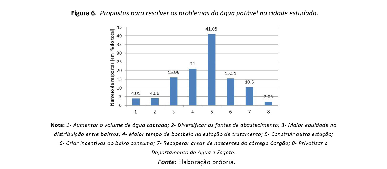 Buscando complementar essas respostas questionou-se, a seguir, como se poderia resolver o problema da falta de água. Nas respostas (figura 6), a maioria propôs construir outra estação de tratamento de agua, ou manter ligadas por mais tempo as bombas na atual estação, evidenciando desconhecimento sobre o fato de as bombas funcionarem atualmente durante as 24 horas para tentar satisfazer a demanda. Outras propostas sugeridas (como distribuir a água de forma mais equitativa entre os bairros e aumentar o volume de água captada diariamente das fontes) indicaram desconhecimento da real situação do sistema de abastecimento de agua potável da cidade.