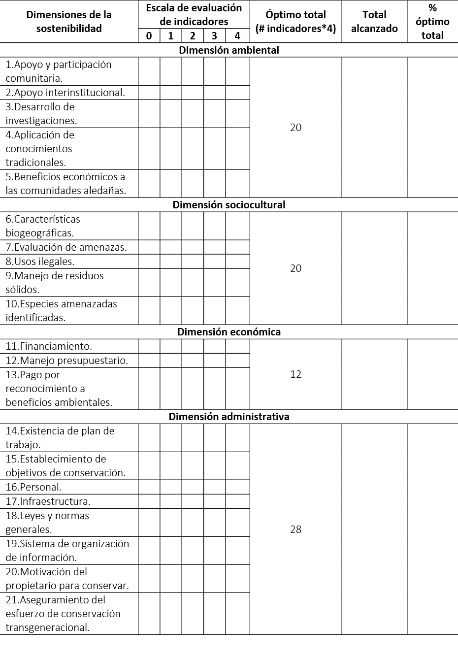 La metodología planteada por Cifuentes et al. (2000), para medir la efectividad en el manejo de áreas protegidas, utiliza una escala de calificación de cinco niveles (0-4); cada uno de ellos se asocia a una ponderación porcentual que expresa el grado de cumplimiento por indicador, que va desde insatisfactorio a muy satisfactorio, como se observa en la tabla 1.