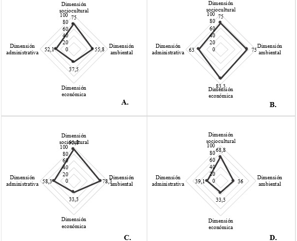 En cuanto a la sostenibilidad de las dimensiones analizadas, en el presente estudio la dimensión sociocultural fue la que presentó mejores niveles, al analizar las cuatro reservas; mientras que la dimensión económica obtuvo los niveles más bajos. Aunque el resultado final de la aplicación del sistema de indicadores es un porcentaje general de sostenibilidad, este valor no es suficiente para proponer acciones de mejoras concretas, que permitan fortalecer los aspectos que así lo requieran. Para esto es necesario desarrollar un análisis desde las cuatro dimensiones y, más específicamente, desde los resultados de los indicadores evaluados.