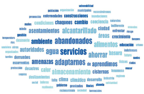 Otro de los resultados observados está referido a las perspectivas desde la urbanización espontánea y descontrolada, y desde la autogestión, donde los campos semánticos de más relevancia identificados fueron los que siguen: conciencia, participación, conocimiento y desastres. Estos señalan a la vulnerabilidad como una combinación de las condiciones sociales y económicas, donde el fenómeno del cambio climático agudiza los problemas sociales ya existentes y contribuye a la profundización de la desigualdad, limitando o potenciando las capacidades de autogestión.