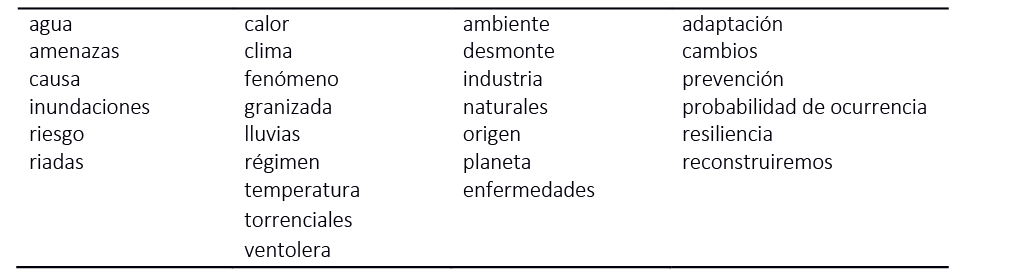 El clima se define como «una descripción estadística del tiempo atmosférico en términos de los valores medios y de la variabilidad de las magnitudes correspondientes durante períodos que pueden abarcar desde meses hasta millares o millones de años» (Panel Intergubernamental sobre Cambio Climático, 2014, p. 180). Los grupos semánticos que presentaron las relevancias identificadas en esta perspectiva se encuentran en la tabla 2.