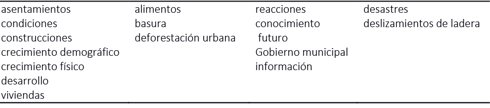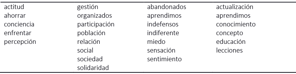 La urbanización espontánea y, en muchos casos, descontrolada está vinculada a las relaciones sociales, formas de comportamiento, creencias, organización, cosmovisión y actuar de las personas, lo que las pone en una situación de mayor o menor exposición a las amenazas, o las hace más sensibles a los efectos de estas (Salamanca, 2007). Los grupos semánticos que presentaron las relevancias identificadas en esta perspectiva se encuentran en la tabla 5.