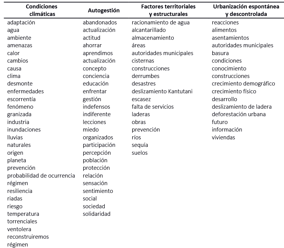Dentro de los resultados que se encontraron a través de los grupos semánticos de mayor relevancia, desde las perspectivas de las condiciones climáticas y desde los factores territoriales y estructurales, están los relacionados con el recurso hídrico, mencionado a partir de diferentes concepciones: escasez (sequías), exceso (riadas), fuente (lluvias, desmontes) e incluso recolección y disposición final (drenajes y alcantarillados). En la misma línea, se observa la relevancia que es otorgada a las categorías de deslizamientos y desastres, incluidas en las perspectivas desde los factores territoriales y estructurales, y desde la autogestión de las vulnerabilidades. A partir de lo anterior, se puede deducir que las construcciones sociales están determinadas por los eventos negativos que se dieron en los últimos años, como por ejemplo: granizada de 2012 (factor potenciador: deficiente drenaje pluvial); deslizamientos de laderas, como el de Cotahuma, en 1996, y el de Kantutani, en 2018 (factor potenciador: deficiente o inexistente sistema de alcantarillado); sequía de 2016 (factor potenciador: ineficiente gestión de reservorios-presas y de la demanda y oferta de agua) según Hoffmann, (2016).