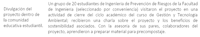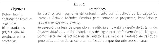 Si bien se inicia el proyecto con auditorías en las cafeterías que permiten determinar la cantidad de residuos generados en el campus. El proyecto se instala entre 2020 y 2021, cuando se suspendieron las clases presenciales como medidas sanitarias a causa de la pandemia de COVID-19, siendo esto una limitación. Las actividades de CE-GESTIONAR se llevaron a cabo como se resume en la siguiente tabla.