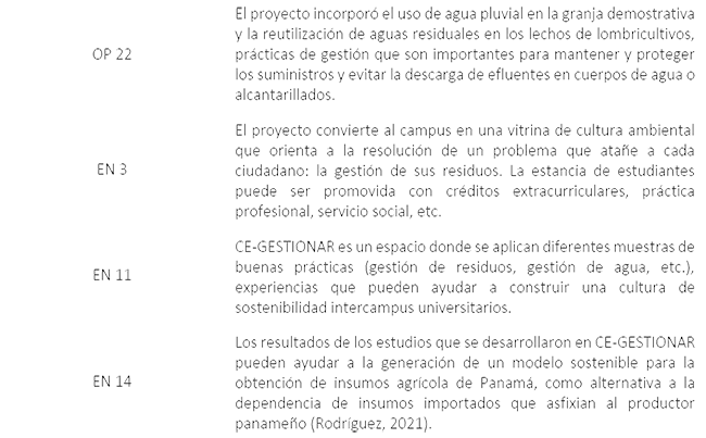 Es importante resaltar que el proyecto CE-GESTIONAR brinda un aporte integral, especialmente en el aspecto académico. En la línea curricular, gracias al trabajo de grado de las dos tesistas, se determinaron y documentaron hallazgos ambientales y de higiene y seguridad industrial, que pueden abordarse en lo adelante como un laboratorio práctico en cursos de auditoría ambiental. Se determinó por primera vez, localmente, la huella ambiental de una operación universitaria que genera gases de efecto invernadero (metano), producto de la descomposición de los residuos orgánicos en vertederos. Se ejemplificó la calificación de sostenibilidad de un campus universitario conforme a una métrica ambiental (UI GreenMetric) y se diseñó una propuesta de Sistema de Gestión Ambiental conforme a los criterios de la ISO 14001:2015 (Organización Internacional de Normalización, 2015); temas actuales que pueden promoverse como líneas curriculares y de investigación. Por tanto, el resultado de este espacio produjo varios insumos para la adecuada gestión operativa de las cafeterías, que enriquecen la dimensión académica (curricular).
