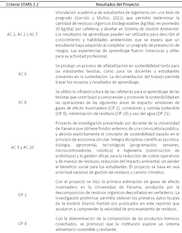 En ese sentido, el presente estudio busca explorar mediante el análisis cualitativo-descriptivo el impacto académico del proyecto de investigación aplicada CE-GESTIONAR, formulado para dar respuesta al tema de gestión ambiental de residuos orgánicos de las cocinas de las cafeterías universitarias. Por lo tanto, la pregunta de estudio formulada es la siguiente ¿se produce un entorno de aprendizaje vivo, de sostenibilidad y flexibilización curricular en función del proyecto? Para el análisis se escoge el Sistema de Seguimiento, Evaluación y Calificación de la Sostenibilidad (STARS 2.2, por sus siglas en inglés) dado su enfoque de evaluación académica que integra la gestión operacional. El estudio es pionero en investigación educativa en Panamá y promueve líneas de investigación emergentes y reflexiones urgentes sobre la gestión de la Educación Superior y los nuevos paradigmas de evaluación y acreditación universitaria.