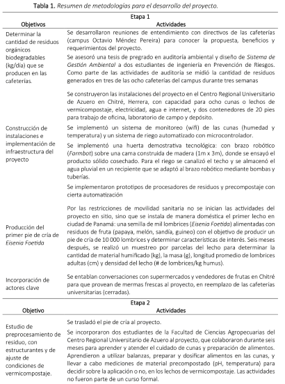 Este proyecto fue ganador de una convocatoria pública de gestión integral de residuos sólidos de la Secretaría Nacional de Ciencia, Tecnología e Innovación (SENACYT, 2018). Fue aprobado y apoyado por la Vicerrectoría de Investigación y Postgrado de la Universidad de Panamá, con la expectativa de procesar residuos frescos de las cocinas de las cafeterías universitarias, mediante la técnica de vermicompostaje, con la lombriz Eisenia Foetida como elemento biotecnológico; y demostrar la transformación de estos residuos en sustancias húmicas. Además de impulsar el aprovechamiento de este producto en huertas de autoconsumo y así reducir los costos operativos de la Universidad, debido a que son consideradas esenciales en la mejora de la estructura del suelo y el crecimiento de las plantas (Blouin et al., 2019; Fernández-Delgado et al., 2020).