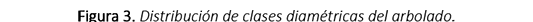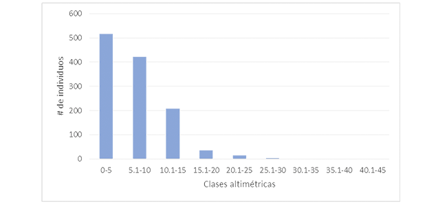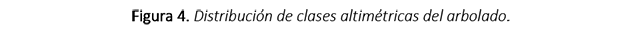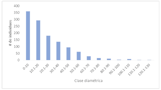 En la figura 3 se presenta la distribución de árboles por clases diamétricas, determinando la primera clase como la más abundante (30%). El 80% de los árboles (n=971) no superan los 40 cm de diámetro. La distribución de clases altimétricas mostró la misma tendencia que las clases diamétricas. El 78% de los árboles no superan los 10 m (figura 4). Solo un árbol alcanzó una altura superior a los 40 m.
