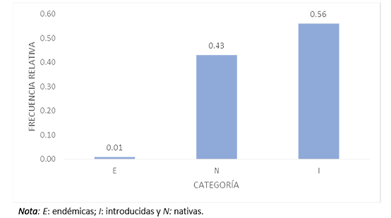 Respecto a la frecuencia de especies categorizadas según su origen y distribución, sobresalen las introducidas, alcanzando el 56%, lo que corresponde a 38 especies. Destaca, como parte del arbolado de las áreas verdes de la Universidad Lay Eloy Alfaro de Manabí, una especie endémica (figura 2).