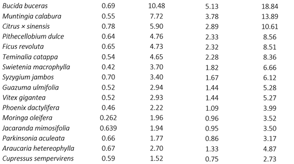 Las mediciones dendométricas determinaron que la especie Azadirachta indica, tiene los ejemplares más altos y, por sus propias características, también tienen el mayor diámetro, así como mayor área basal y volumen. A pesar de lo anterior, en el área de estudio la variable más influyente para determinar las especies con mayor área basal y diámetro a 1.30 m fue la abundancia.