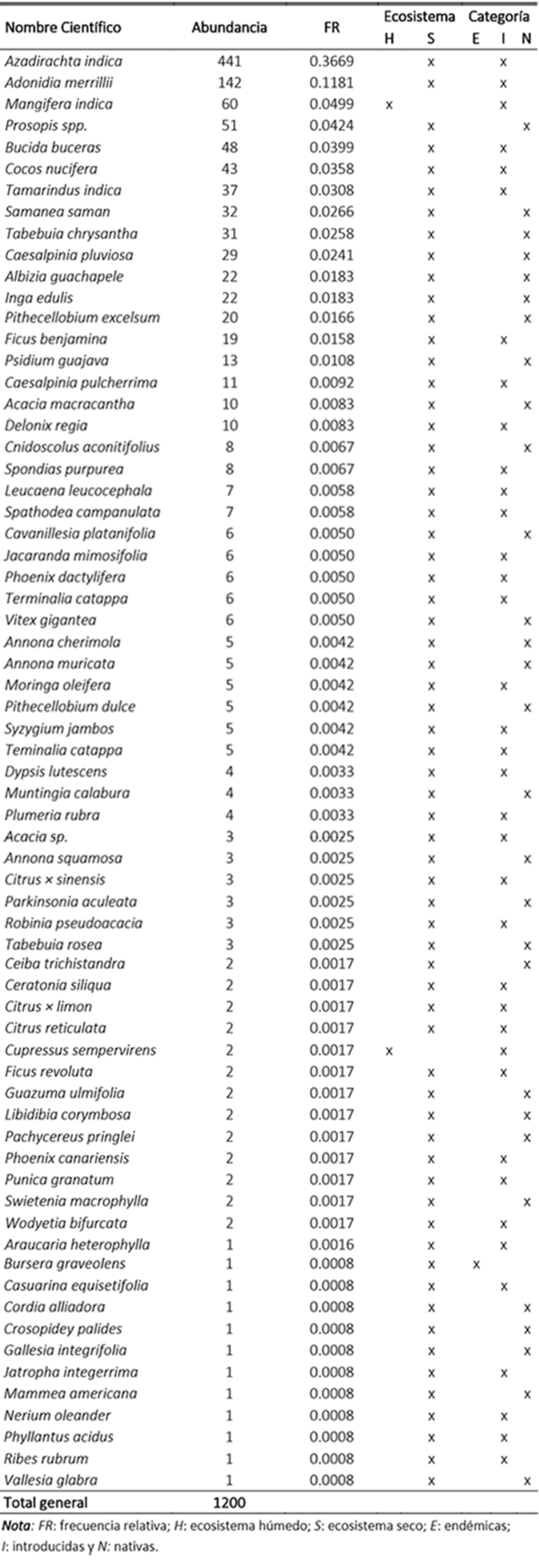 El arbolado de las áreas verdes de la Universidad Laica Eloy Alfaro de Manabí se encuentra distribuido de forma heterogénea entre parques, jardines y aceras de la institución. Como resultado de la evaluación en campo se identificaron un total de 68 especies de árboles y 1200 individuos. La especie más abundante fue Azadirachta indica (37%), seguida por la especie Adonidia merrillii (12%), ambas introducidas. La mayoría de las especies (66) identificadas han sido descritas como afines a ecosistemas secos (tabla 1).