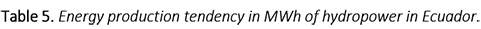 Moreover, the total average means each year of a 0.95% energy reduction in hydropower production. For the projects to be in operation until 2025 from the National Determined Contribution, we can throw a future decrease with the tendency calculated in Table 5. Thus, we need the temperature and precipitation information, the official trends establish that climate change is a worldwide problem, and Ecuador is not unaware. To the reference period 1960 – 2015, the rains increased on the Coast by 33%; Sierra by 13%, and only in the Amazon was a 1% reduction in rainfall where rains were previously common (Ministry of the Environment, 2019; Naranjo-Silva, Punina, Álvarez, 2022).
