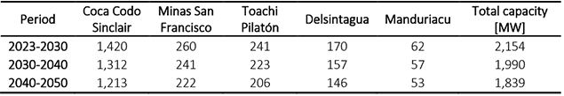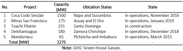 In both approaches, the National Determined Contribution of Ecuador determines the five analyzed projects, contributing to the interconnected national system of 2275 MW and a projection of the future capacity to 2050 (Corporación Eléctrica de Ecuador, 2021).