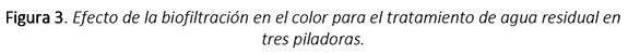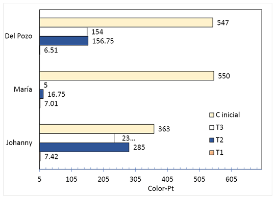 El color del agua residual de la piladora Del Pozo (C inicial) disminuyó de 547 a 6.51 mg/L Pt-Co en el tratamiento T1. En los tratamientos T2 y T3, disminuyó a valores entre 156.75 y 154 mg/L Pt-Co. Para el agua residual de la piladora María el color mejoró, pues la ceniza en T1 redujo el color de 550 a 7.01 mg/L Pt-Co. Con el uso del carbón activado se redujo a 16.75 mg/L Pt-Co en T2; y a 5 mg/L Pt-Co en T3. Para el agua residual de la piladora Johanny la ceniza del tratamiento T1 permitió la reducción de color de 363 a 7.42 mg/L Pt-Co; en cambio la biofiltración en T2 decoloró ligeramente de 363 a 285 mg/L Pt-Co y en T3 hasta 238.5 mg/L Pt-Co.