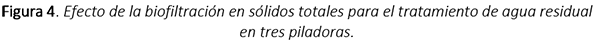 En contraste, para las variables sólidos totales y pH, el ANOVA de un factor demostró que, para un valor de p > 0.01 no se obtuvo una diferencia significativa entre los tratamientos aplicados en comparación con el agua residual doméstica. En el presente caso el proceso de biofiltración no tendió a generar un cambio sustancial en el pH del agua, dada la naturaleza de adsorción física y reacción bioquímica de degradación sin generación de iones hidrógeno. En el tratamiento con 200 gr de carbón activado la piladora María fue el más efectivo para remover sólidos totales; mientras que en las otras piladoras y tratamientos no hubo una remoción. Por esta razón se obtuvo un valor de p > 0.01.
