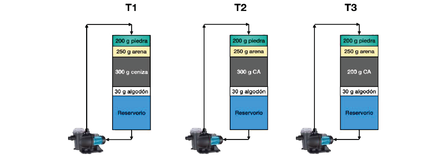 En todos los tratamientos, como lechos de soporte, se utilizaron 200 g de piedra grava, 250 g de arena y 30 g de algodón (figura 1).