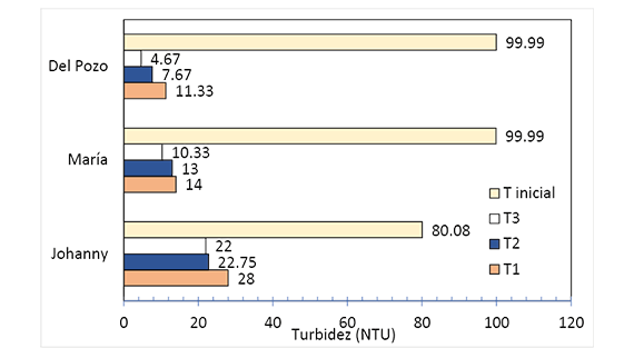 En la figura 5 la disminución de turbidez (NTU) fue notoria en todos los tratamientos. En la piladora Del Pozo la turbidez inicial del agua residual (T inicial) disminuyó en T1 de 99.99 a 11.33 NTU; en T2 la turbidez se redujo a 7.67 NTU y en T3 a 4.67 NTU. Para la piladora María la reducción de turbidez fue menor que en la piladora Del Pozo; donde la turbidez se redujo de 99.9 a 14 NTU en tratamiento T1. Por su parte, en T2 se redujo la turbidez a 13 NTU y en el tratamiento T3 la remoción fue hasta 10.33 NTU. Por su parte en la piladora Johanny la turbidez del agua residual disminuyó en T1 de 80.08 a 28 NTU, en T2 hasta 22.75 NTU y en T3 hasta 22 NTU.