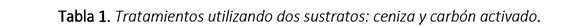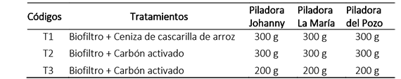 En la tabla 1 se presentan los tratamientos realizados en tres unidades experimentales independientes. En el tratamiento T1 se trabajó con dosis de ceniza de cascarilla de arroz sin activar de 300 g. Para los tratamientos T2 y T3 se utilizó carbón activado producido a partir de cascarilla de las piladoras estudiadas. En T2 se utilizaron 300 g de carbón activado, mientras que en T3 se utilizaron 200 g del mencionado material. Se aplicó un diseño experimental completamente al azar, con tres repeticiones.