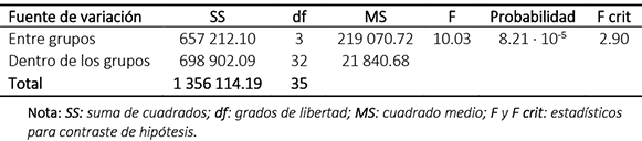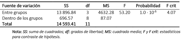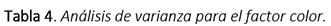 El ANOVA de un factor (Microsoft-Excel) demuestra que para un valor de p < 0.01 se obtuvo una diferencia significativa entre los tratamientos aplicados en comparación con el agua residual doméstica para las variables color y turbidez, como se indica en las tablas 3 y 4.
