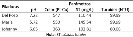 En la tabla 2 se resumen los parámetros del agua residual doméstica de las tres piladoras objeto de estudio.