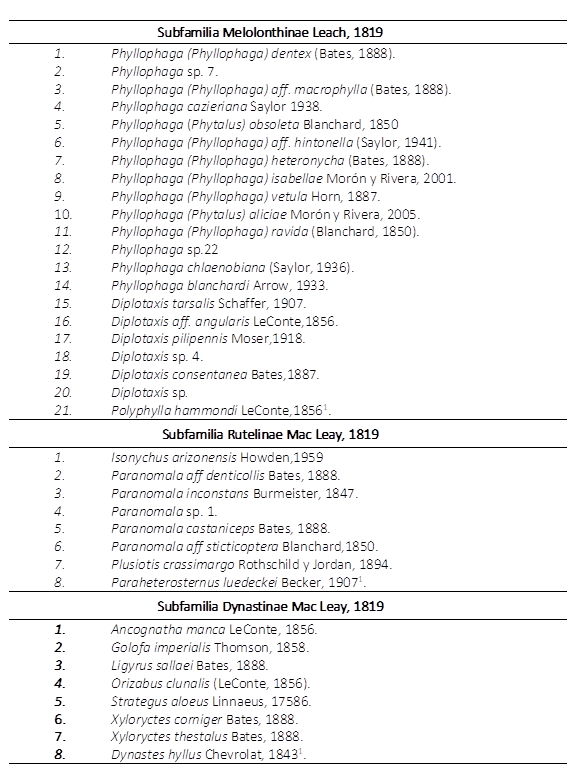 Se capturaron 452 individuos, pertenecientes a tres subfamilias (Melolonthinae, Dynastinae y Rutelinae), 11 géneros y 34 especies. La subfamilia Melolonthinae fue la más abundante con 349 individuos y la más rica en especies con 21, mientras que las subfamilias Dynastinae y Rutelinae presentaron siete y seis especies respectivamente. El género Phyllophaga presentó la mayor riqueza con un total de 14 especies, seguido por Diplotaxis con seis especies, mientras que Paranomala y Xyloryctes representaron cinco y dos especies respectivamente. El resto de los géneros presentaron una especie cada uno como se muestra en la tabla 2.