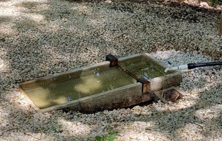En el SCALLUNA hay un remanente de 4 m3, por lo que se optó por construir un abrevadero en el Sendero El Cornizuelo, para contribuir con la conservación de la fauna silvestre mediante el aporte del recurso hídrico de manera constante durante todo el periodo de investigación. Este abrevadero, cuenta con las siguientes dimensiones: 1,32 m de largo, 0,44 m de ancho, 0,23 m de profundidad, grosor de pared de 5 cm y un volumen aproximado de 121 litros (figura 3).