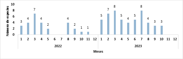 La distribución de especies por mes durante el período de muestreo mostró que, en el año 2022, los meses donde más mamíferos se registraron fue marzo (siete especies) seguido de febrero, abril y agosto (cuatro especies), enero (tres especies), mayo y setiembre (dos especies), octubre y noviembre (una especie). Mientras que en junio, julio y diciembre no hubo ningún registro.