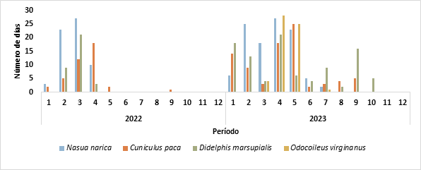 Para el año 2022, las especies con mayor IAR se registraron en los meses de febrero a abril. El mamífero con mayor presencia fue N. narica con 23 días en febrero y 27 días en marzo, seguido de D. marsupialis, 21 días de marzo. En 2023 se incrementó la presencia de mamíferos en el Sendero El Cornizuelo, O. virgianus estuvo presente 28 días en marzo y 25 en mayo, N. narica 27 días en abril y 25 en febrero, mientras que D. marsupialis 21 días en abril y 18 en enero, asimismo, esta especie fue la más constante dado que se reportó en todos los meses de actividad en 2023 (figura 5).