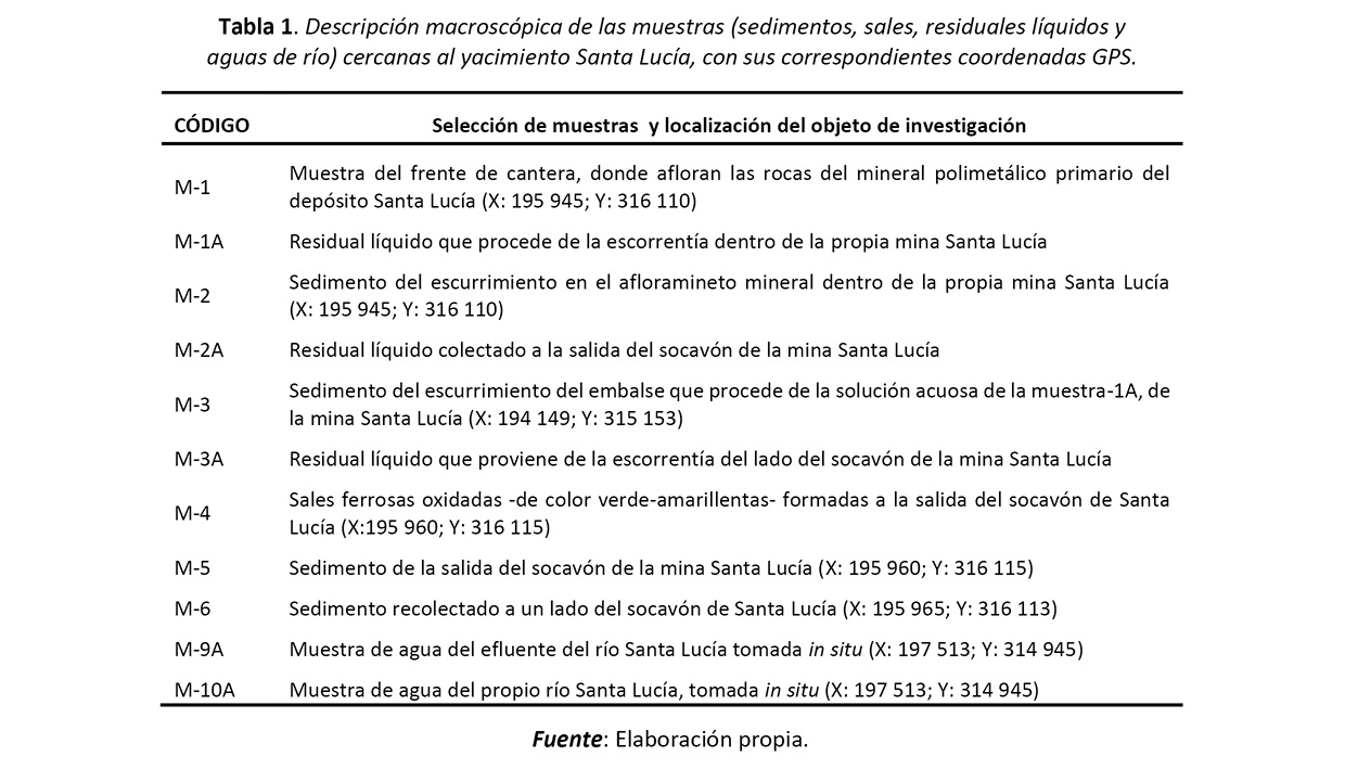 Partiendo de la aplicación del método geológico de itinerarios irregulares, se describieron un total de ocho puntos, tomados directamente en el terreno; se tomaron 11 muestras de aguas residuales, sedimentos y minerales. La localización georreferenciada se realizó teniendo en cuenta, como factor predominante para la selección, la extensión de la contaminación que se observó in situ en cada zona de interés, en dos fases investigativas; y los periodos lluviosos y poco lluviosos (tabla 1).