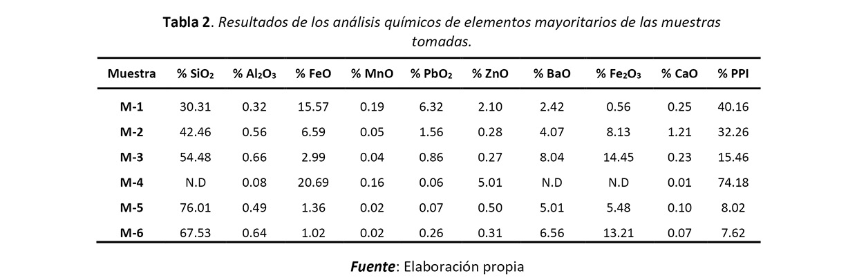 En la tabla 2 se muestran los resultados de los análisis químicos mayoritarios de las muestras tomadas. En la muestra de roca primaria M-1 se refleja el quimismo característico de las menas pirito-polimetálicas de Pb, Zn y Ba, de Santa Lucía. El resto de las muestras presentan la composición química típica de los sedimentos formados durante la intensa contaminación ácida existente. Estos análisis evidencian la contaminación de la región, producto a la exposición de los yacimientos por largos periodos de tiempo.