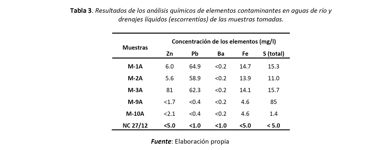 En la tabla 3 se muestran los resultados representados en los análisis físico-químicos de elementos contaminantes, contenidos en aguas de río y drenajes líquidos (escorrentías); se comprueba el incumplimiento de la norma cubana NC 27:2012 (ONN, 2012) para los elementos Zn, Pb y Fe; otra evidencia de la intensidad del proceso de drenaje ácido asociado al yacimiento.