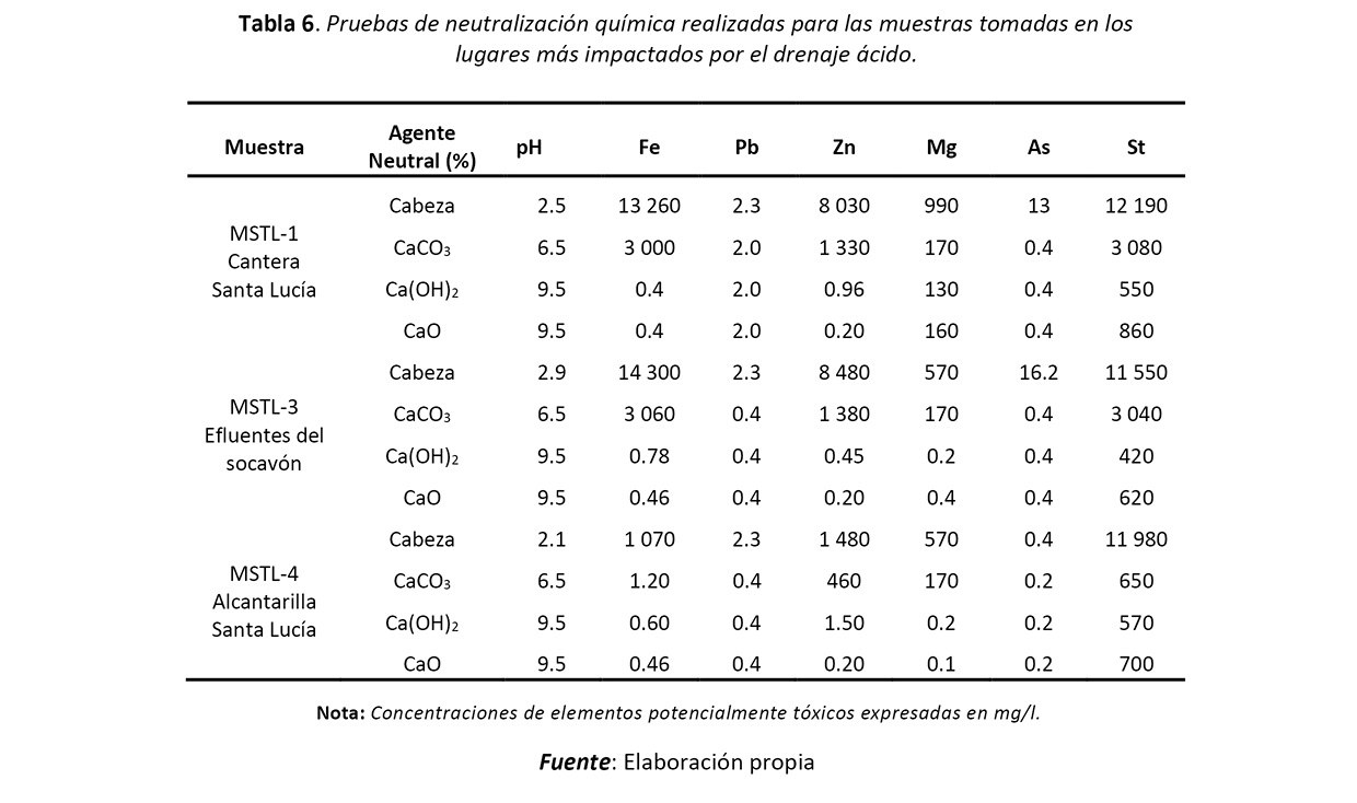 El comportamiento de las pruebas de neutralización química empleando los diferentes agentes neutralizantes en las campañas de muestreo realizadas, se reporta en la tabla 6. El orden de lixiviación a temperatura ambiente de los minerales portadores de elementos potencialmente tóxicos sería el siguiente: FeS2 (pirita), ZnS (esfalerita) y PbS (galena).
