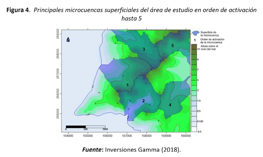 La herramienta Watershed (Surfer 11), que usa el algoritmo de punto de vertido de ocho direcciones para calcular la dirección del flujo en cada nodo de los archivos Grig, obtenidos del MDT, permitió definir las microcuencas y su orden de activación (figura 4). Lo más significativo de esta dinámica se puede observar en el extremo noroeste del embalse Laguna Grande (microcuencas 3 y 5), el cual capta agua hacia la presa en período seco y aporta agua a la vertiente oeste en eventos extremos, donde llega a invertirse el flujo, cuya magnitud de vertido no solo corta la carretera hacia punta Colorada, sino que aporta a los caudales de las lagunas Garnacha y Los Pozos.