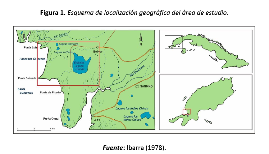 El área de estudio, localizada en el extremo occidental de Cuba, al noroeste de la provincia Pinar del Río, ocupa un sector del litoral del municipio Sandino (figura 1). Su límite oeste es la bahía de Guadiana y al norte el municipio Mantua.