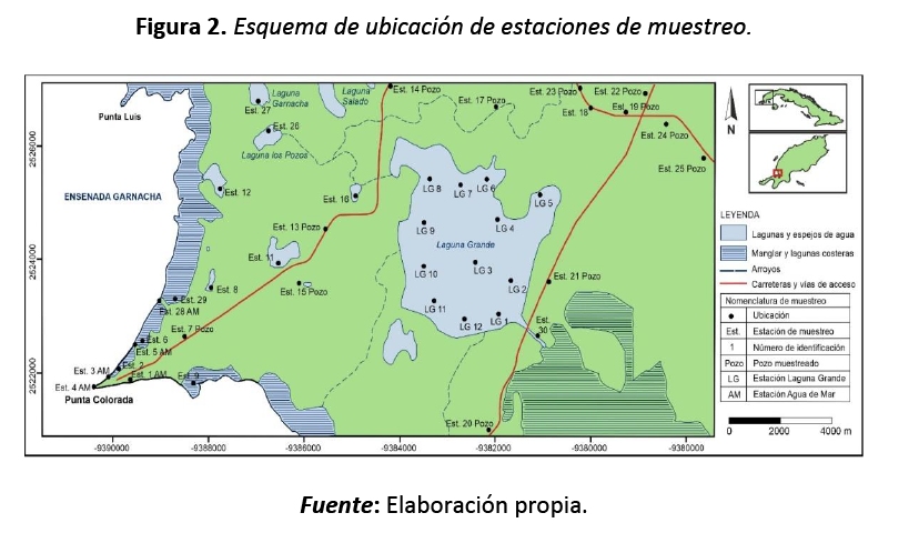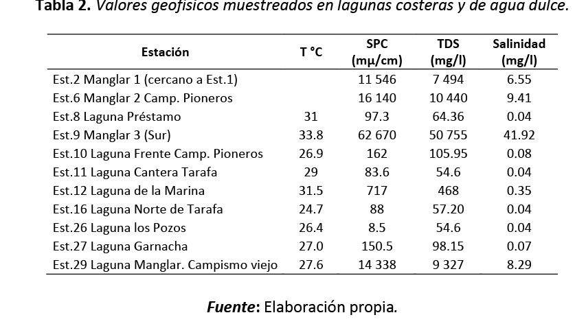 Los indicadores geofísicos de las 11 estaciones lacustres, muestreadas en mayo de 2018, se exponen en la tabla 2. La laguna Garnacha, según las características hidroquímicas identificadas, clasifica como aguas cloruradas sódicas (Cl-Na), patrón representativo en estos espejos de agua naturales cercanos a la costa.