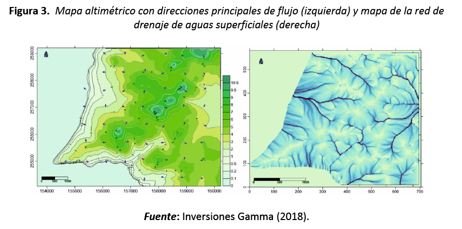 El mapa altimétrico generado a partir del Modelo Digital del Terreno (MDT) permitió la definición de una red de drenaje de microcuencas con escorrentía eventual y en muy pocos casos, estacional, a pesar de ser una región de paisaje llano muy plano hacia la costa, con pendientes despreciables en la faja litoral (figura 3).