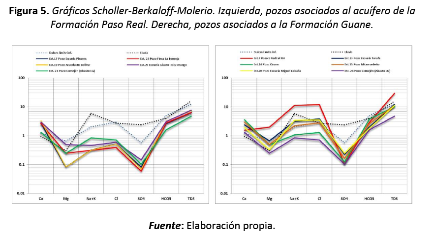 Para el caso de los pozos ubicados a menos de 10 m de profundidad y asociados al escurrimiento de los depósitos poco consolidados arenosos y pisos de arcillas, de la Formación Guane, se identificaron patrones hidroquímicos de aguas bicarbonatadas-cloruradas-sódicas (HCO3-Cl-Na) que confirman la presencia de otro acuífero (figura 5):