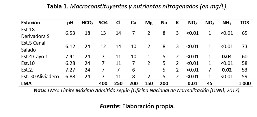 De acuerdo con la información de las muestras tomadas en las fuentes más representativas de la zona de estudio, los valores de macroconstituyentes y nutrientes nitrogenados de las aguas subterráneas, solo en dos estaciones, sobrepasan el límite máximo admitido por la Norma Cubana de Agua Potable (ONN, 2017).