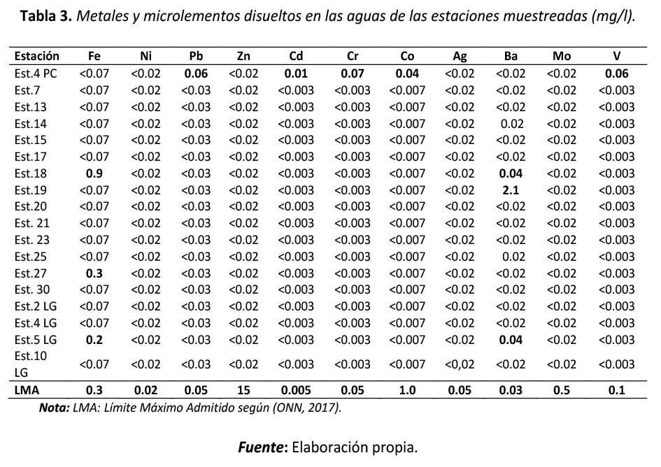 Las concentraciones de metales disueltos analizados responden a las características geológicas de la región (tabla 3), aunque llamaron la atención los valores de plomo (Pb), cadmio (Cd), cromo (Cr) y vanadio (V), detectados en la muestra de agua de mar correspondiente a la estación 4 punta Colorada, probablemente relacionados con la operación petrolera realizada en el área marítima, argumento que se ha considerado comprobar en estudios posteriores.