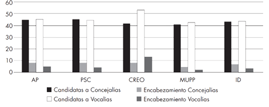 En el ámbito político ecuatoriano la mujer ha incrementado su participación. En el último proceso eleccionario se visualiza un ligero crecimiento de la presencia de mujeres asambleístas (37%), prefectas (17%), alcaldesas (8%) y miembros de juntas parroquiales (26%). Espacios que se van ampliando debido a la reforma e inclusión en la normativa electoral que promueve su participación en este ámbito, así como también por los procesos permanentes de formación profesional, capacitación, desarrollo y demostración de capacidades, habilidades y destrezas, que permiten seguir posicionándose en la sociedad para ocupar el sitial que se merece y le corresponde; a pesar que el machismo persiste en ciertas áreas, donde aducen que los espacios no pueden ser liderados aún por mujeres.