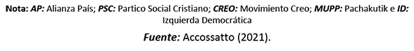 Accossatto, R. (2021). El lugar de las mujeres en los partidos políticos de América Latina: el caso de Ecuador. Revista CIDOB d’ Afers Internacionals, (127), 201-28. https://doi.org/jgr2