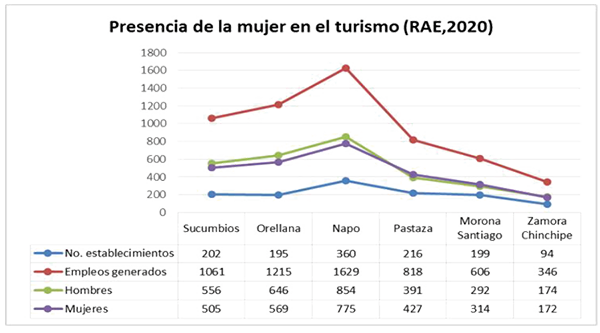 Na pesquisa, foram identificados espaços de ação para a força de trabalho feminina envolvida no turismo para determinar seus processos e formas de participação. O estudo foi descritivo e exploratório, utilizando diferentes indicadores para identificar a participação das mulheres que acessam empregos, gestão e ensino universitário. Os resultados enquadraram-se na participação das mulheres em cerca de 50% dos postos de trabalho gerados, maioritariamente ao nível operacional e em menor escala de dirigentes e gestores relacionados com o ambiente de trabalho do turismo. Politicamente, no processo eleitoral de 2019, registrou-se a presença de 17.39% de prefeitos e 8.14% de prefeitos. A empregabilidade das mulheres na região está concentrada nas províncias de Napo e Orellana. No campo acadêmico, a representação de mulheres na docência é de 36%, em cargos de gestão 44% e 58% dos alunos. Aspectos como valores, atitudes, normas, papéis, estereótipos, habilidades, aptidões, entre outros, constituem variáveis de gênero, que promovem uma hierarquização da organização social na sociedade; onde a maioria dos homens ocupa as posições-chave, relacionadas ao poder.