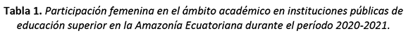 En el ámbito de la educación superior, la RAE cuenta con la presencia de dos instituciones públicas con sede matriz en este territorio, una en la provincia de Pastaza y otra en la provincia Napo; en la tabla 1 se presentan datos sobre la participación de la mujer en las funciones de docencia y gestión, así como la matriculación estudiantil en ambas instituciones.