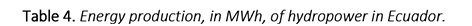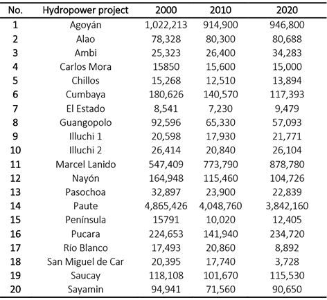 As mentioned in the methodology, the historical behavior of the plants over the last 20 years is first understood to analyze future hydroelectric production. To do energy examination, we use data from the Ministry of Energy to 20 hydropower projects in Ecuador, doing the specification of energy generated in MWh to 2000, 2010, and 2020 in table 4.