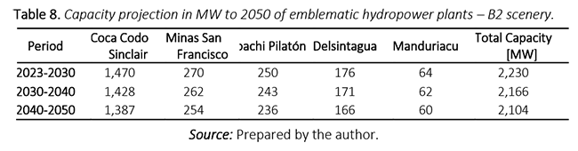 The presented scenarios show a lineal reduction denominated A1 that can accumulate up to 1839 MW to 2050, in the medium scenario denominated B1 the capacity can show up to 1995 MW, and in the conservative scenario B2 up to 2104 MW. The total capacity for the five emblematic hydropower projects (Coca Codo Sinclair, Manduriacu, Minas San Francisco, Toachi Pilatón, and Delsintagua) that were thought of at 2275 MW initially. Therefore, the projection has a percentual reduction to 2050 of 19%, 12 and 8% of their capacities to the scenarios A1, B1, and B2 respectively.