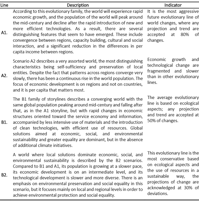 In our methodology, at the researcher's criterion, we just take lines A1, B1, and B2 because we believe that these are the evolution aspects more realistic for the future scenarios when the projections depending on the region evolution with gradual changes, accelerated in some sectors and slow in others, in addition to criteria of divided economic growth marked by developed countries and partially by developing countries.