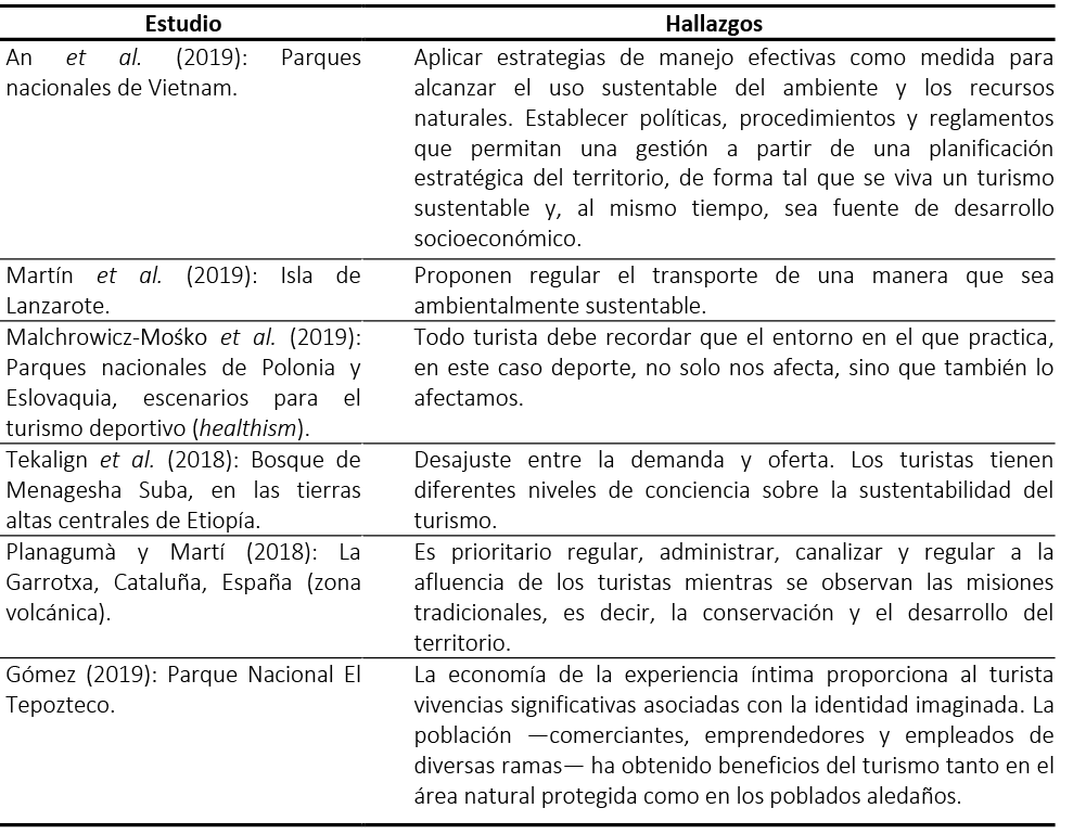 Ante esta problemática, es oportuno recordar el valor por el cual los gobiernos les otorgaron, a tales territorios, la condición de áreas naturales protegidas; declaratoria cuyo fin persigue limitar el desarrollo de las actividades económicas en ellas, favorecer la conservación de sus características naturales y sociales únicas, y proteger su biodiversidad; pese a sus potencialidades para crear destinos turísticos atractivos. Esta paradoja ha motivado diversos estudios que analizan la influencia ejercida por el turismo en dichos lugares (tabla 2); los que deberían ser un referente de aprendizaje y para la toma de decisiones.