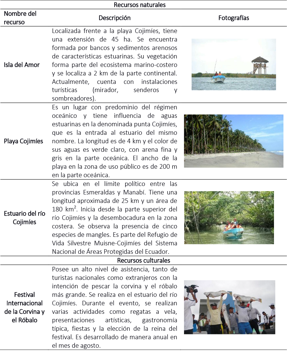 El balneario se encuentra en el estuario del río Cojimíes y es un hábitat de manglares poseedor de recursos turísticos, como la Isla del Amor, la playa Cojimíes y punta Palmar. Además, se realizan varios festivales gastronómicos y culturales. En la tabla 3 se presentan los principales recursos naturales y culturales, y sus características más importantes.