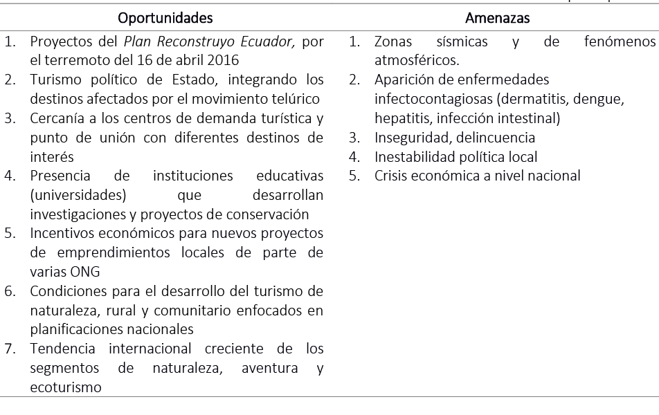 Esta fase finalizó con un análisis turístico estratégico mediante la matriz FODA, lo que posibilitó identificar las fortalezas, oportunidades, debilidades y amenazas del territorio. La evaluación de estos factores internos y externos permitió identificar las estrategias apropiadas para el desarrollo del turismo en Cojimíes.